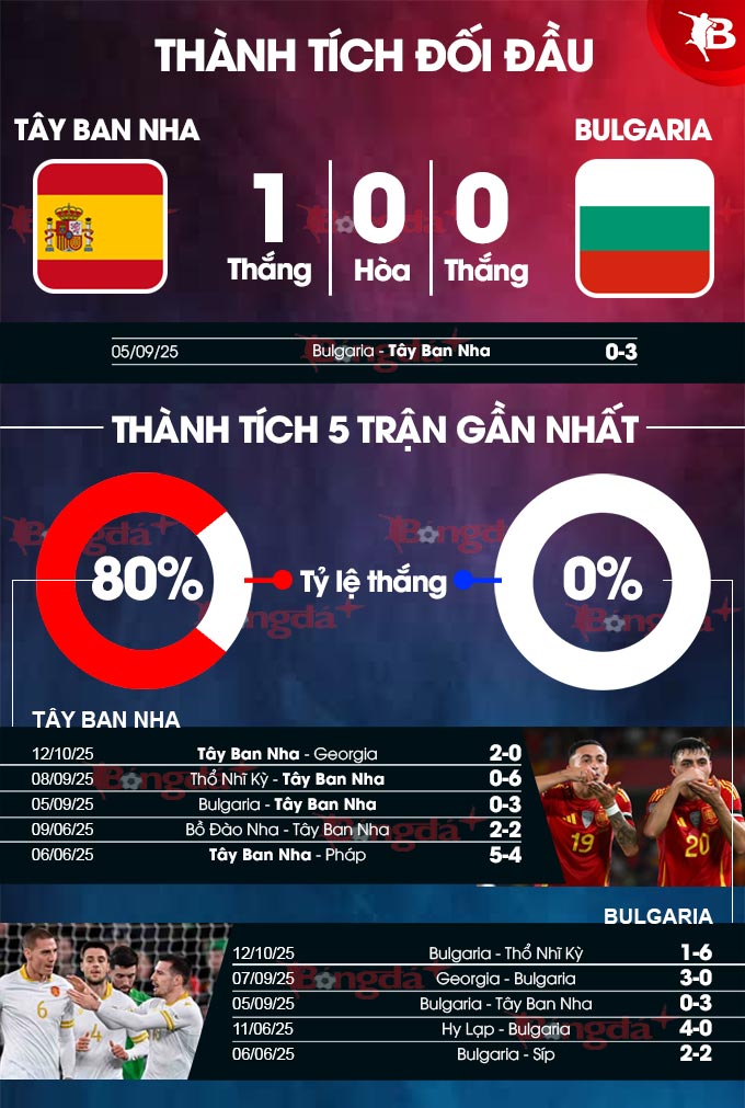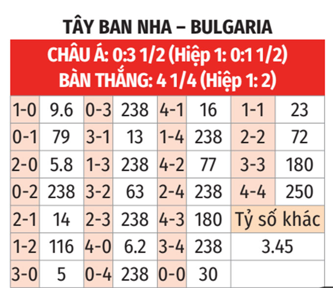 - Không quá 4 bàn: 3/4 trận gần đây của Tây Ban Nha chỉ có tối đa 4 bàn. 8/9 trận vừa qua của Bulgaria cũng diễn ra theo kịch bản tương tự.