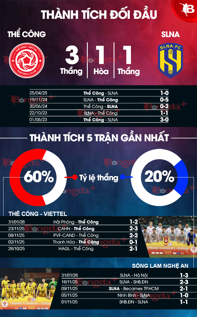 Thể Công Viettel chưa bao giờ là đối thủ dễ chơi với SLNA. Xét về tương quan lực lượng, đội chủ nhà được đánh giá cao hơn. Với phong độ ấn tượng hiện tại, Thể Công Viettel nhiều khả năng sẽ tiếp tục có thêm một chiến thắng trước đội bóng xứ Nghệ.