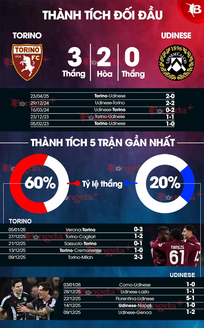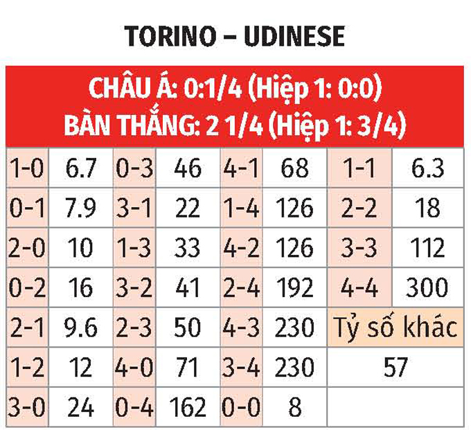 Chưa hết, 5 lần so T gần đây, Torino bất bại khi thắng 3 và hòa 2 trước Udinese. Đặc biệt, trong 9 lần làm khách trước Torino, Udinese chỉ thắng có 1, còn lại thua 6 và hòa 2. Do đó, không ngạc nhiên nếu Torino có trọn vẹn 3 điểm ở trận này.