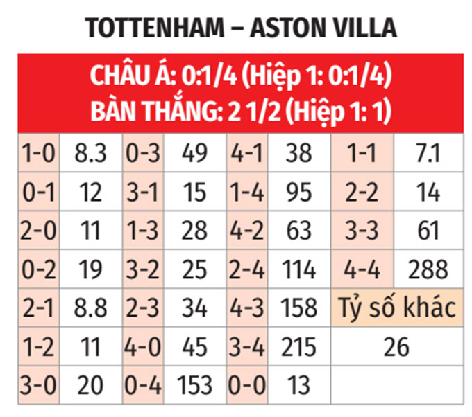 - Trên 3 thẻ vàng: 3 trận gần đây của Tottenham có điểm chung là đều có tối thiểu 4 thẻ vàng. 4/5 trận gần nhất của Aston Villa cũng diễn ra theo kịch bản tương tự.