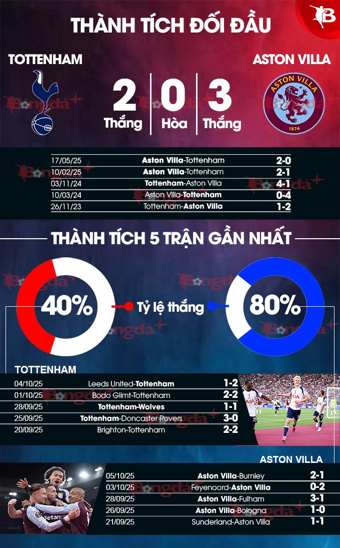 - Lưới rung cuối trận: 4/5 trận vừa qua của Tottenham có bàn thắng được ghi trong 8 phút cuối. 3/4 trận gần nhất giữa Aston Villa và Tottenham bảng tỷ số còn cập nhật từ phút 90 trở đi.