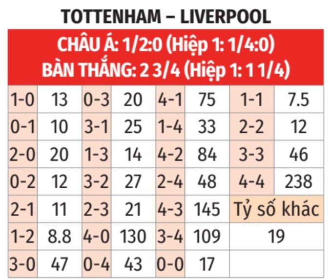 - Tối thiểu 3 bàn thắng: 7/8 lần đối đầu giữa 2 đội gần đây đều xuất hiện ít nhất 3 bàn thắng. 8/9 trận gần đây của Tottenham và 5/7 trận sân khách vừa qua của Liverpool tương tự.