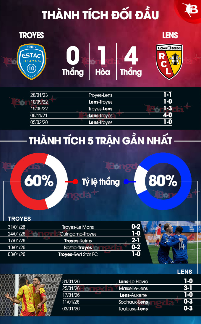 - Lens thắng theo châu Á: Lens thắng 4, hòa 1, thua 1 ở 6 chuyến làm khách gần nhất tại Troyes, thắng 8/12 trận gần đây, thắng 5/6 chuyến làm khách vừa qua. Còn Troyes thua cả 2 trận gần nhất. Xem ra, giới mộ điệu có thể tin tưởng vào Lens ở trận này.