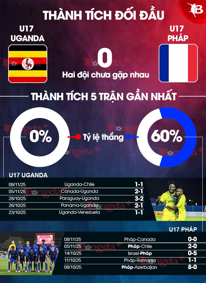 - Hai hoặc ba bàn cả trận: 7/8 trận gần nhất của U17 Uganda và 5/8 trận vừa qua của U17 Pháp tại xứ người đều khép lại với 2 hoặc 3 bàn thắng cả trận. Ngoài ra, 4/5 trận gần đây trên sân trung lập của U17 Uganda cũng có 2 hoặc 3 lần lưới rung cả trận.