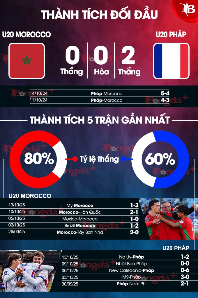 - Từ 3 bàn trở lên: 3/4 trận gần đây của U20 Morocco cùng 4/5 trận vừa qua của U20 Pháp đều có ít nhất 3 bàn thắng. 2 trận đối đầu gần nhất thậm chí có tối thiểu... 7 bàn thắng.