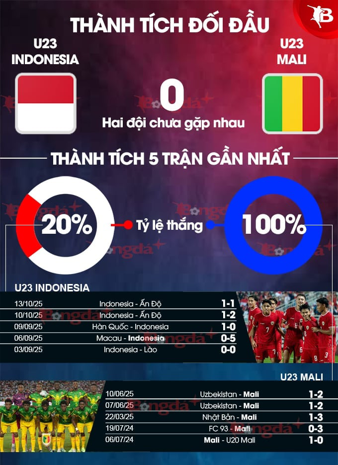 - Hai đội đều có bàn thắng: 4/5 trận gần nhất của U23 Indonesia có bàn thắng. U23 Mali ghi bàn trong cả 5 trận gần nhất.