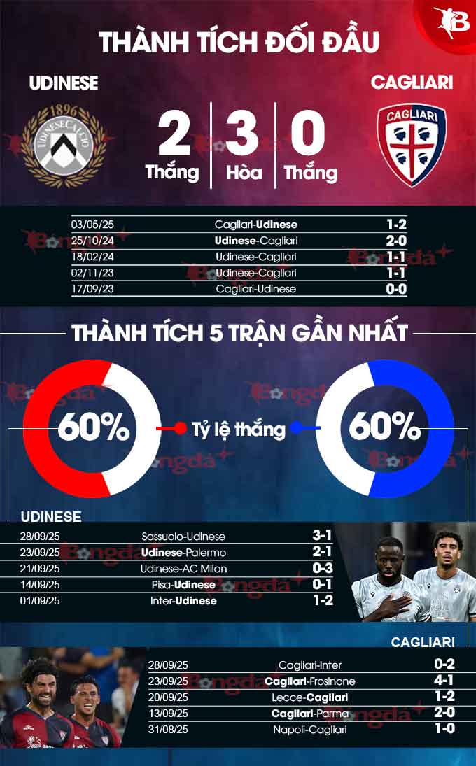 - Bùng nổ bàn thắng: Những trận đấu có sự góp mặt của Udinese thời gian qua thường diễn ra với thế trận rất cởi mở và hấp dẫn, khi 4/5 trận gần đây đều có từ 3 bàn thắng trở lên. Với Cagliari, 2/3 trận vừa qua của các cầu thủ khách cùng trận đối đầu gần nhất cũng xuất hiện tối thiểu 3 pha làm bàn.