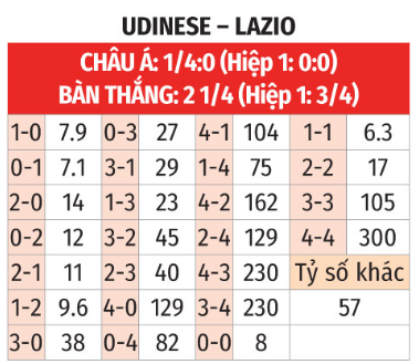 - Từ 2 đến 3 bàn: Cả 5 trận gần đây của Udinese với tỷ lệ châu Á từ 0 đến 1/4 bàn đều khép lại với tổng bàn thắng rơi vào đoạn từ 2 đến 3. Cả 4 lần gần nhất họ chạm trán Lazio cũng có từ 2 tới 3 lần lưới rung.