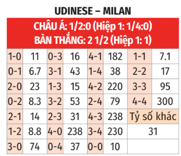 - Từ 2 đến 3 bàn: 4/5 trận chính thức gần đây của Milan và 3/4 trận sân nhà gần nhất của Udinese đều có từ 2 đến 3 bàn thắng.