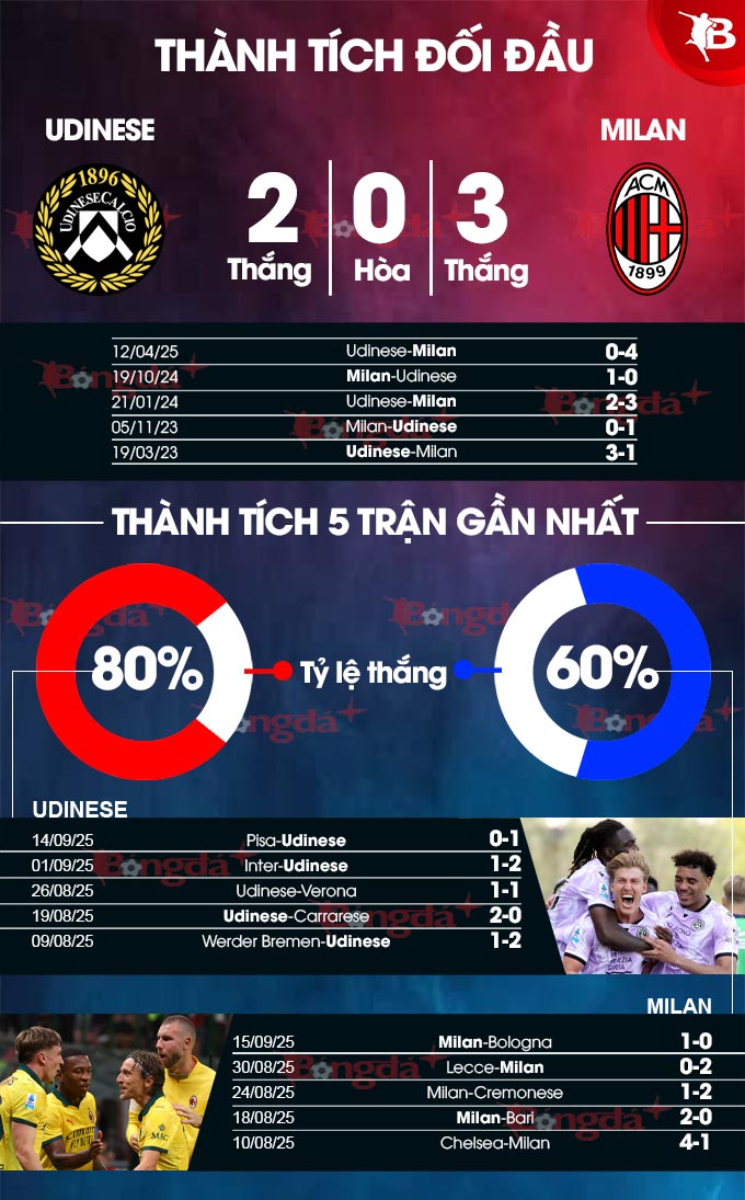 Milan toàn thắng cả 3 lần gần nhất chạm trán Udinese, trong đó Rossoneri ghi cả thảy 8 bàn. Với tinh thần cao và thành tích đối đầu tốt, Modric và đồng đội sẽ giành trọn 3 điểm.