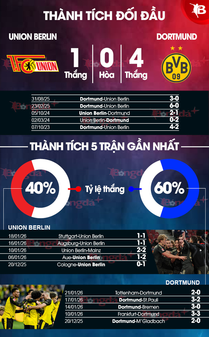 Trong khi đó, Dortmund vừa kết thúc mạch 4 trận liền bất bại bằng việc để thua 0-2 trước Tottenham tại mặt trận Champions League. Do đó, Dortmund sẽ nỗ lực để có chiến thắng trước Union Berlin để quên đi thất bại tại London vừa qua.