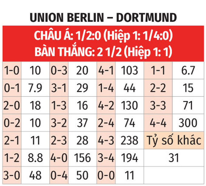 - Hai đội cùng ghi bàn: Union Berlin thành công trong việc ghi bàn ở 9/10 trận gần nhất còn với Dortmund là ở 8/10 trận vừa xong. Bên cạnh đó, Union Berlin ghi bàn ở 8/10 trận vừa qua trên sân nhà còn với Dortmund là ở 9/10 trận sân khách gần đây. Với xu hướng như vậy, khả năng cao hai đội sẽ cùng tìm được đường vào khung thành của nhau.