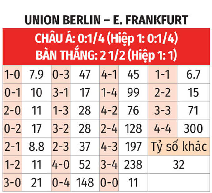 Có lợi thế sân nhà nhưng Union Berlin chỉ thắng 1/7 trận gần nhất. Tương tự, Frankfurt khi chỉ thắng 1/7 trận sân khách vừa xong. Do đó sẽ chẳng ngạc nhiên nếu trận này kết thúc với kết quả hòa.