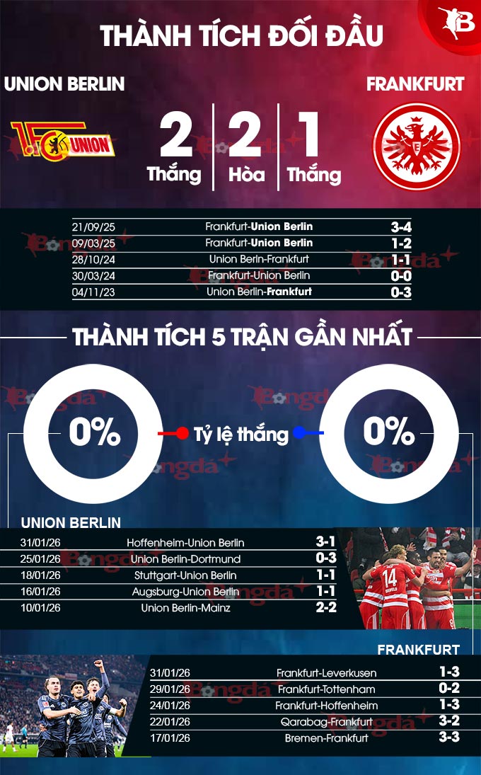Frankfurt vẫn chưa biết thắng lợi ở thời gian gần đây còn Union Berlin phong độ cũng không khá hơn. Không ngạc nhiên nếu trận này kết thúc với kết quả hòa.