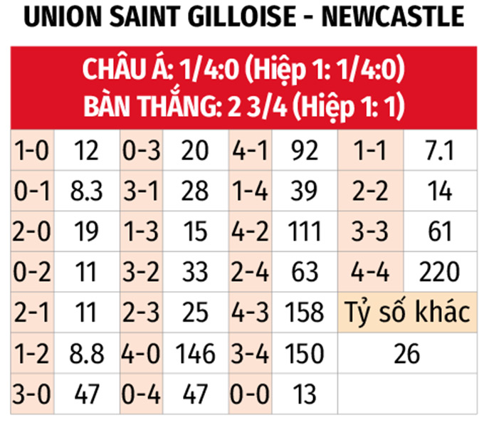 - Union SG thắng châu Á: Các cầu thủ Newcastle thua theo châu Á ở 4/5 trận sân khách gần đây nhường chủ nhà 1/4 trái như trận này. Newcastle hiện thua châu Á 5/7 trận vừa qua. Với Union SG, đội chủ nhà thắng châu Á 4 và hòa 1 ở 5 trận gần nhất.
