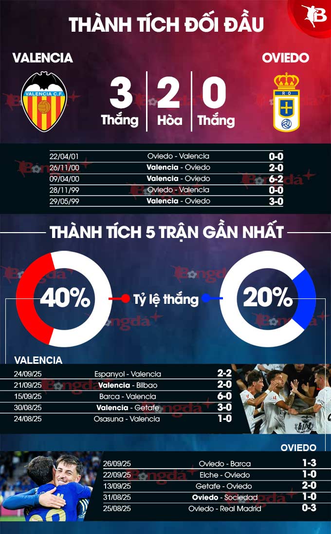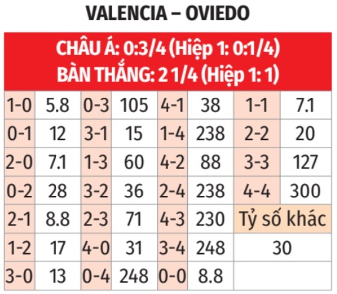 - Nhiều bàn thắng hiệp 1: 7/9 trận gần đây của Valencia đều có từ 1 bàn thắng trở lên trong hiệp 1. Tình trạng tương tự xảy ra ở cả 6 trận gần nhất của Oviedo.