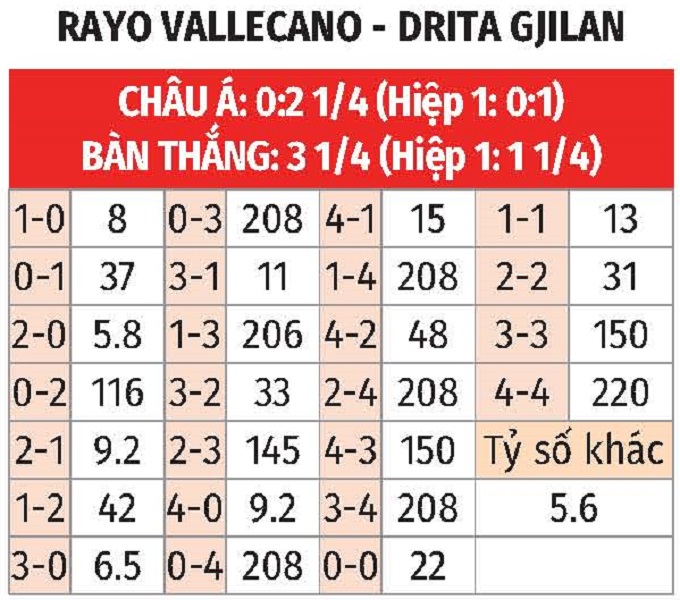 - Tối đa 2 bàn thắng: 6/8 trận gần đây của Vallecano đều kết thúc với nhiều nhất 2 bàn thắng được ghi. Với Drita Gjilan, 7/8 trận vừa qua của đội khách trên mọi đấu trường cũng có tối đa 2 lần lưới rung.