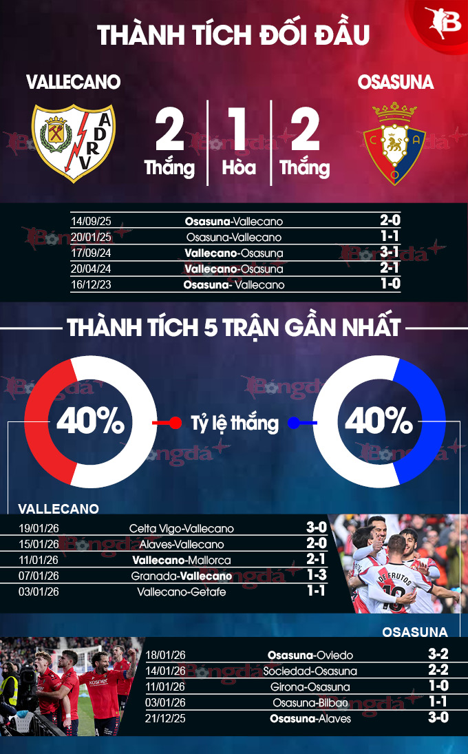 2 - Trong 4 lần gặp Osasuna trước đây, HLV Inigo Perez của Vallecano thắng 2, hòa 1 và thua 1.