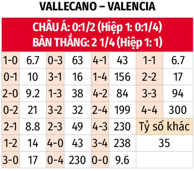 - Tối đa 1 bàn hiệp 1: 4/5 trận gần đây của Vallecano cùng 13 trận đối đầu gần nhất đều kết thúc với nhiều nhất 1 bàn trong hiệp đầu tiên. Với Valencia, 4/6 trận vừa qua của đội khách thậm chí hiệp 1 có tỷ số hòa 0-0.