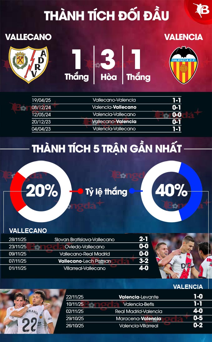 Các cầu thủ Vallecano có thành tích 4 trận thắng, 4 trận hòa và 5 trận thua sau 13 vòng đấu La Liga mùa này, với 16 điểm giúp họ đứng ở vị trí thứ 13 trên bảng xếp hạng. Los Franjirrojos bước vào trận đấu này sau thất bại 1-2 trước Slovan Bratislava tại Conference League, trong khi họ đã hòa hai trận gần nhất tại giải đấu hàng đầu Tây Ban Nha với Real Madrid và Real Oviedo.