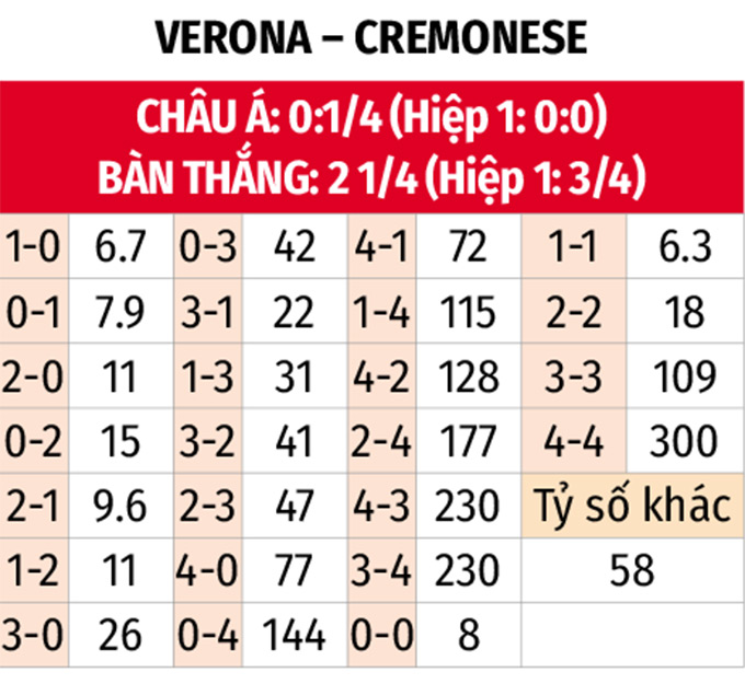 - X bàn thắng: 3/4 trận gần đây của Verona có tối đa 2 bàn thắng. Hàng thủ Cremonese giữ sạch lưới ở 3/5 trận vừa qua. Ngoài ra, 6/7 trận đối đầu gần nhất cũng có không quá 2 pha làm bàn.