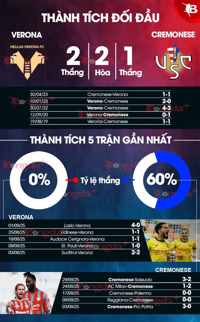 Tân binh Cremonese đang cho thấy mình sẵn sàng sắm vai ngựa ô ở mùa giải năm nay bằng hai màn trình diễn bùng nổ, và trước một Verona không có phong độ tốt nhất, họ có sự tự tin nhất định để tìm kiếm kết quả có lợi.