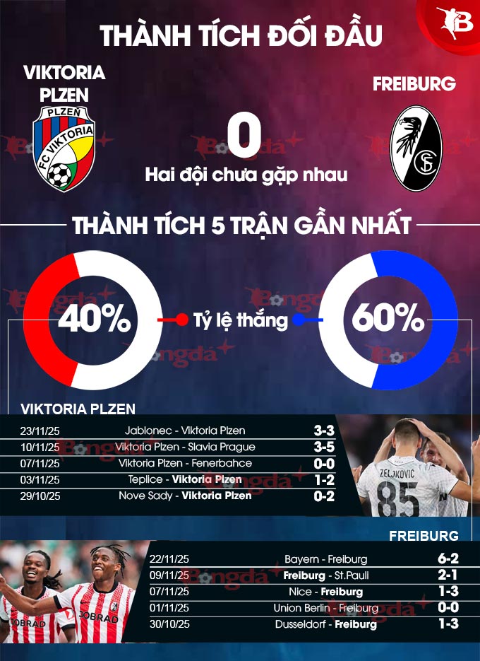 Trong khi Plzen chỉ thắng 2/5 trận vừa xong thì Freiburg thắng 3/5 trận mới đây. Viktoria Plzen có lợi thế sân nhà và có thành tích khá ổn tại đây khi chỉ thua 1/5 trận vừa xong.