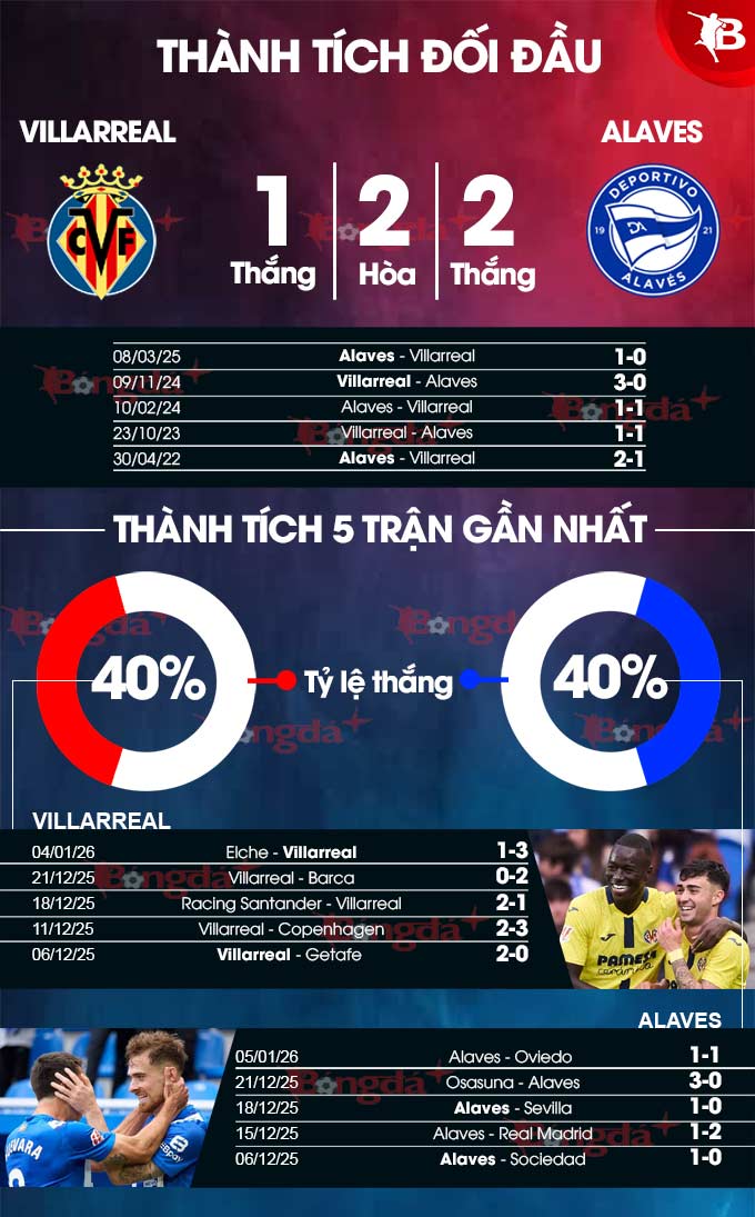 - Tối thiểu 3 bàn cả trận: 6/7 lần đối đầu giữa 2 đội gần đây trên sân của Villarreal đều kết thúc với tối thiểu 3 bàn thắng. Tình trạng tương tự xảy ra ở 3/4 trận gần đây của Villarreal và 4/5 trận sân khách mới nhất của Alaves.