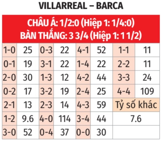 - Tối thiểu 2 bàn hiệp 1: 5/7 lần đối đầu giữa hai đội gần đây trên sân của Villarreal đều xuất hiện từ 2 bàn thắng trở lên trong hiệp 1. 11/13 trận gần đây của Barca ở La Liga cũng có tối thiểu 2 bàn hiệp 1.