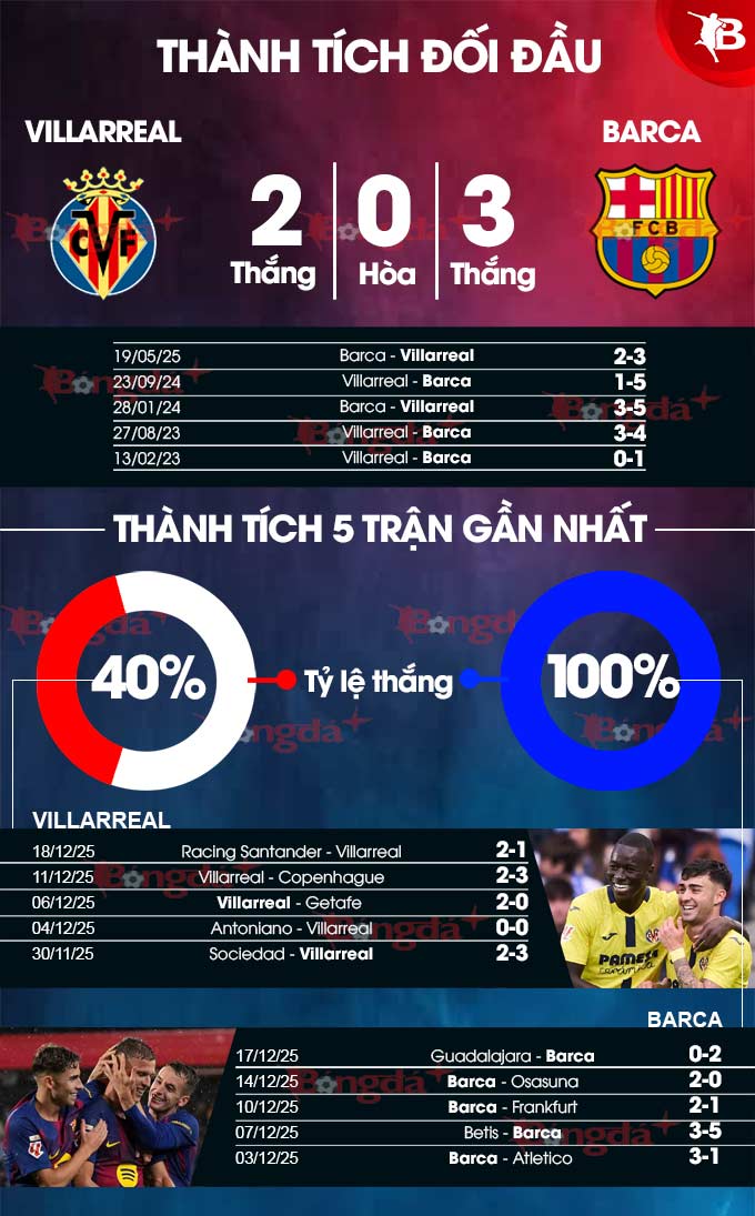 - Chẵn bàn thắng: 6/8 trận đấu gần đây của Villarreal ở La Liga kết thúc với tổng số bàn thắng là số chẵn. 9/11 trận chính thức vừa qua của Barca xảy ra tình trạng tương tự.