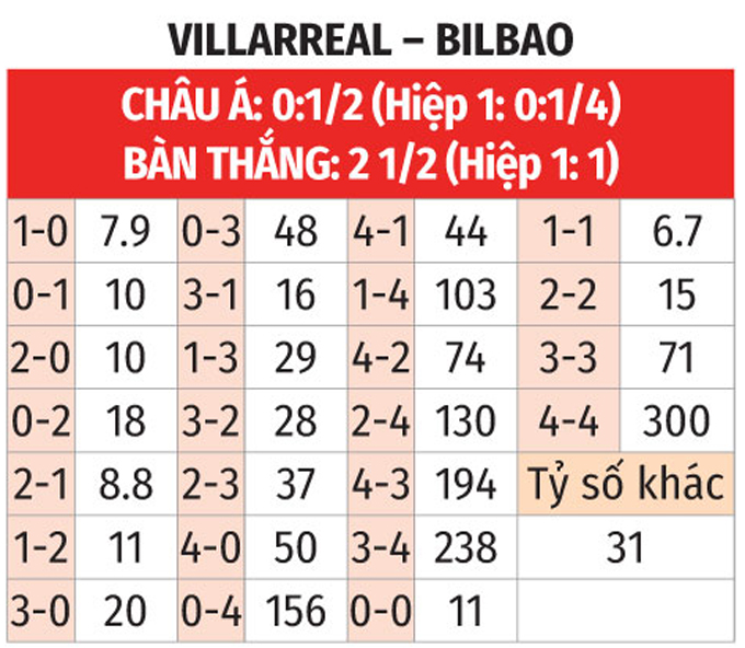 - Chẵn bàn thắng: 4/5 trận đối đầu gần nhất giữa 2 CLB có tổng bàn thắng chia hết cho 2. Ngoài ra, 3/5 trận sân nhà vừa qua của Villarreal và 3 trận vừa xong của Bilbao chứng kiến điều tương tự.