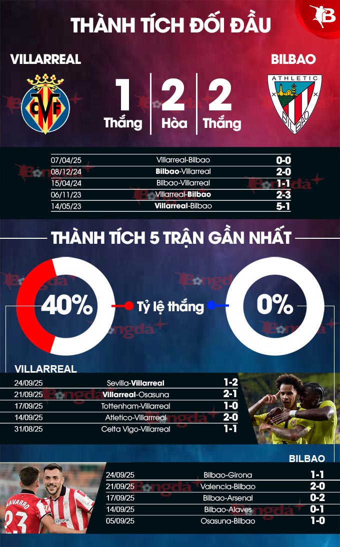 Tại màn so T sắp tới, Villarreal có lợi thế sân nhà và phong dộ đang tốt tại đây khi toàn thắng kể từ mùa giải mới khởi tranh, còn Bilbao thắng 1 và thua 1 ở 2 trận sân khách mới đây.