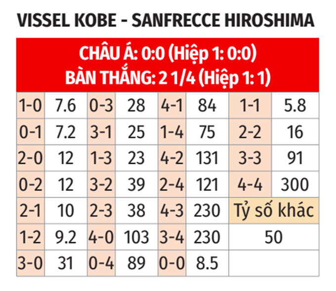 - Lẻ bàn thắng: 5/8 trận gần nhất của Vissel Kobe và 5/7 trận gần đây của Sanfrecce Hiroshima đều khép lại với tổng bàn thắng là lẻ. Ngoài ra, 6/9 trận sân nhà vừa qua của Vissel Kobe và 3/4 chuyến làm khách gần đây của Sanfrecce Hiroshima đều có tổng bàn thắng không chia hết cho 2. Trận này khó có ngoại lệ.