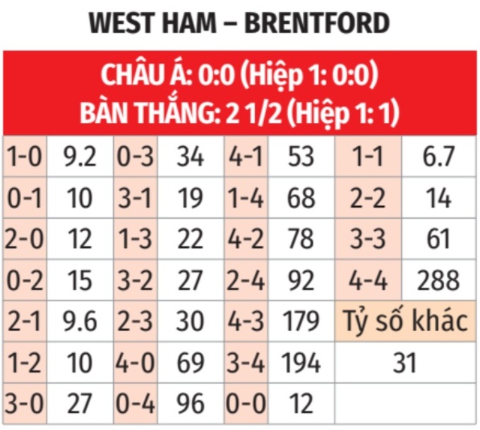 - Nhiều bàn thắng hiệp 1: 5 lần gặp giữa 2 đội gần đây đều có từ 1 bàn thắng trở lên trong hiệp 1. Tình trạng tương tự xảy ra ở 5/7 trận gần đây của West Ham và 17/18 trận mới nhất của Brentford.