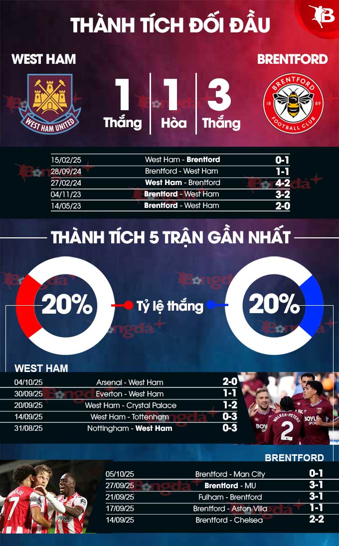 Phong độ gần đây của Brentford cũng khá bất ổn. Nhưng dẫu sao, họ cũng chỉ thau 5/17 trận đấu chính thức vừa qua, còn lại hòa 5 và giành 7 chiến thắng, ấn tượng nhất là chiến thắng 3-1 trước MU tại vòng 6. Thế nên, Brentford không có lý do để quá lo lắng khi phải đến làm khách trên sân của một đội đang khủng hoảng trầm trọng như West Ham.