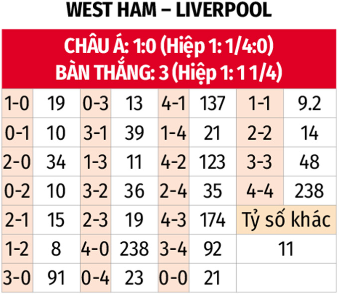 - Tối thiểu 2 bàn hiệp 1: 10 trận đối đầu gần nhất đều có bàn thắng trong hiệp 1, với 5 trận có từ 2 bàn trở lên. 4 trận liên tiếp gần đây của West Ham, 5/8 trận vừa qua của Liverpool cũng có ít nhất 2 lần lưới rung trước giờ nghỉ.
