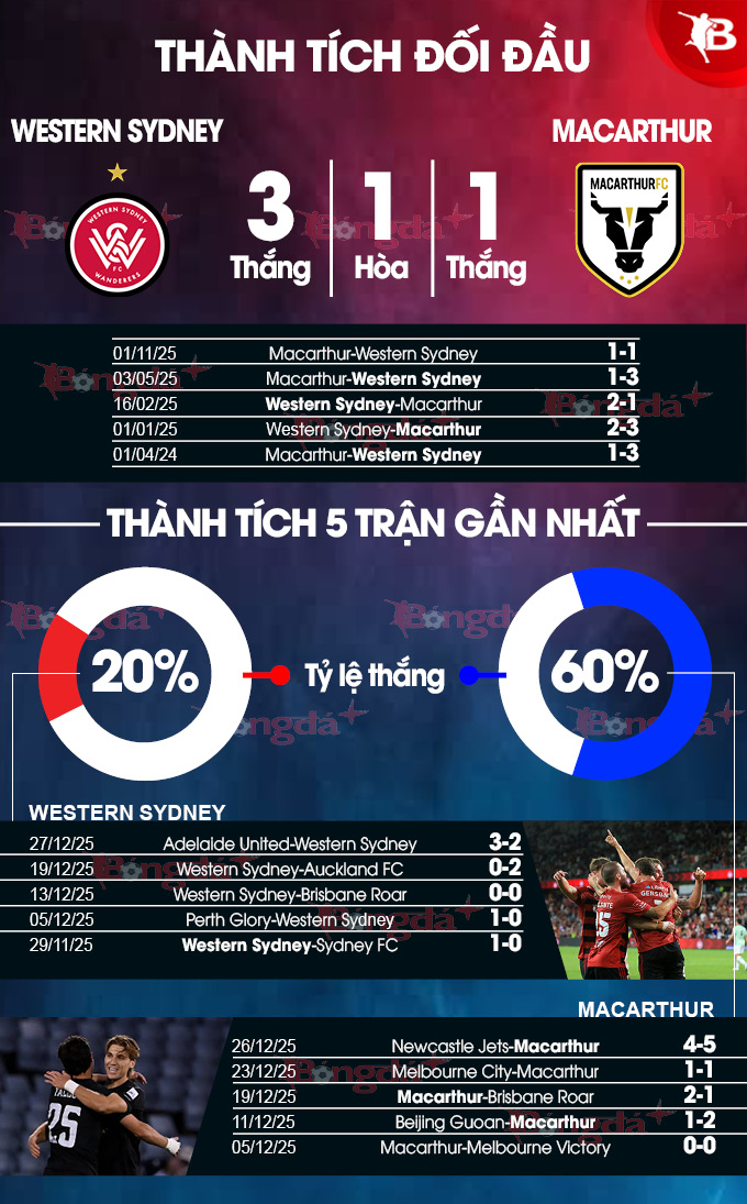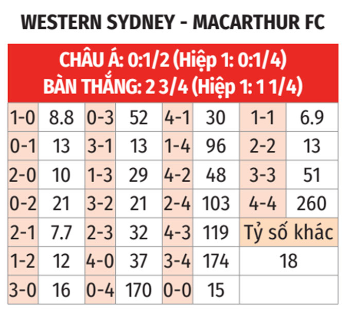 - Tổng bàn thắng lẻ: 4/6 trận gần đây của Western Sydney kết thúc với tỷ số lẻ. 3/4 trận vừa qua của Macarthur cũng có số bàn thắng không chia hết cho 2.