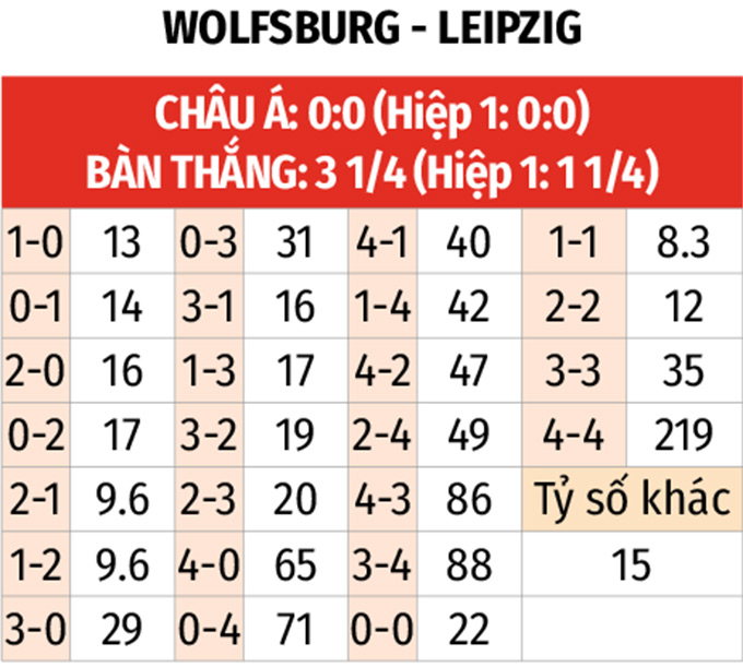 - Ít nhất 1 bàn hiệp 1: 7/8 trận đối đầu gần nhất giữa hai đội đều xuất hiện tối thiểu 1 bàn trong hiệp thi đấu đầu tiên. Kịch bản này hoàn toàn có thể tái diễn, khi 7 trận liên tiếp gần đây của Wolfsburg cùng 9/10 trận vừa qua của RB Leipzig cũng đều có bàn thắng trước giờ nghỉ. Thậm chí, 6/10 trận vừa qua của RB Leipzig có từ 2 bàn trở lên trong hiệp một. Với những gì hai đội đã và đang thể hiện, có thể chờ giảm tổng bàn giảm về 1 hòa để cổ vũ mưa bàn thắng hiệp đầu.