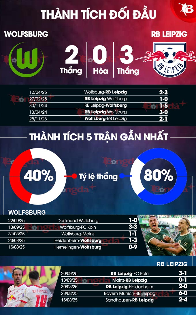 - Bùng nổ bàn thắng: 3/5 trận chính thức từ đầu mùa của Wolfsburg cùng 9/11 trận vừa qua của RB Leipzig đều có từ 3 bàn thắng trở lên. Lịch sử đối đầu cũng ghi nhận 4/5 trận gần nhất gặp nhau có tối thiểu 3 pha làm bàn.