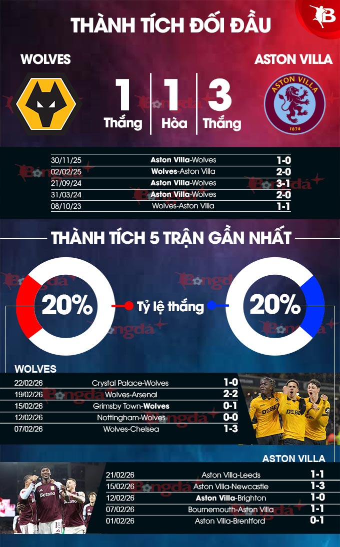 Hơn nữa, nếu tính riêng 6 trận gần nhất đón tiếp Aston Villa trên sân nhà tại Ngoại hạng Anh, Wolves thắng 4, hòa 1 và chỉ thua 1. Ngoài ra, việc vừa cầm hòa Arsenal 2-2 trên sân nhà cách đây 2 vòng cũng là động lực để họ nuôi hy vọng giành điểm trước đội bóng có trụ sở ở Birmingham.
