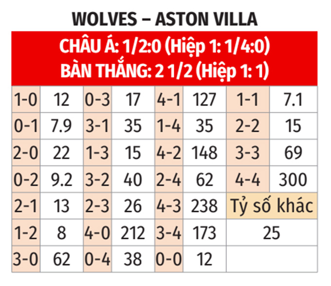 - Chẵn bàn thắng: 4/5 cuộc đối đầu gần nhất, 6/8 trận gần đây của Wolves và 3/4 trận vừa qua của Aston Villa đều có tổng bàn thắng là chẵn. Hơn nữa, kết cục tương tự cũng xảy ra ở cả 4 trận sân nhà gần đây của Wolves.