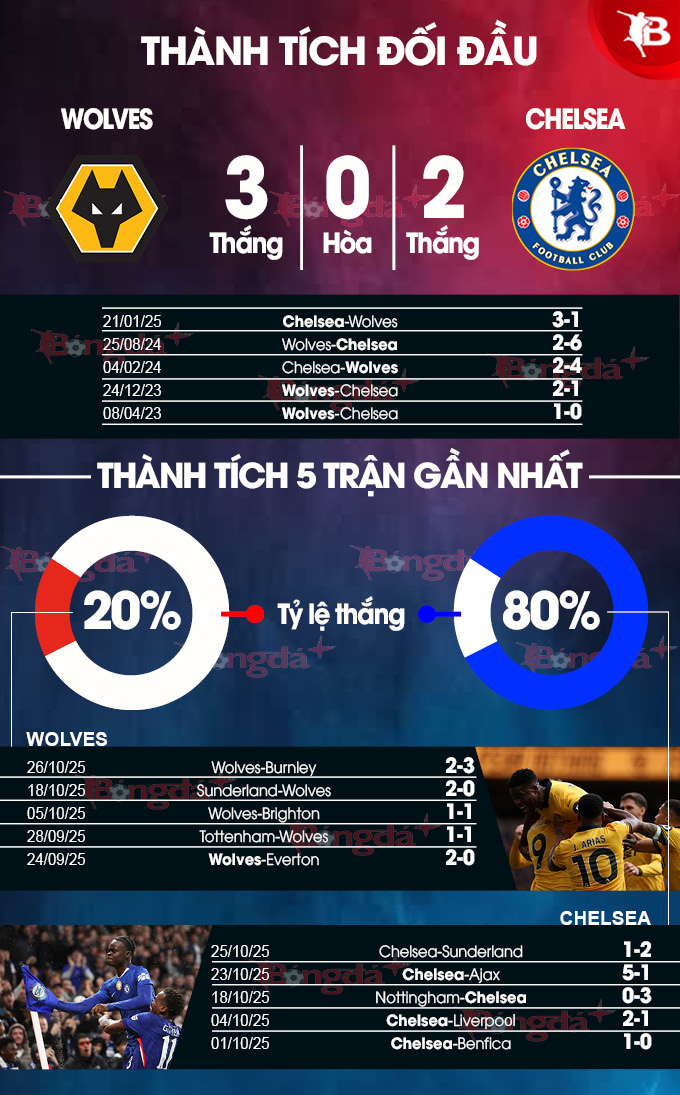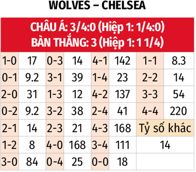 - Hai đội cùng ghi bàn: 4 trận gặp nhau gần nhất giữa Wolves và Chelsea bàn thắng đều đến hai đầu khung thành. Kịch bản này hoàn toàn có thể tái diễn, khi xu hướng "công làm, thủ phá" đang đến ở 8/10 trận gần đây của Chelsea, đội ghi 21 bàn nhưng cũng để thua 13 bàn. Với Wolves, 5/7 trận vừa qua của các cầu thủ chủ nhà cũng xuất hiện bàn thắng ở hai đầu sân.
