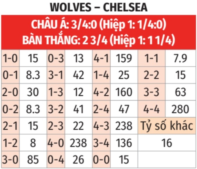 • Tối đa 1 bàn hiệp 1: 4/5 lần chạm trán giữa 2 đội gần đây trên sân của Wolves tại giải Ngoại hạng Anh đều chỉ có tối đa 1 bàn thắng trong hiệp 1. Tình trạng tương tự xảy ra ở 5/7 trận sân nhà gần đây của Wolves và 8/10 trận gần nhất của Chelsea.