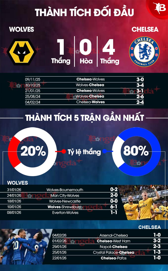 Trong quá khứ, Wolves cũng không phải là đối thủ xứng tầm với Chelsea. Bằng chứng là trong 4 lần chạm trán giữa 2 đội gần đây, đội bóng thủ đô London toàn thắng. Đặc biệt, họ có tới 16 lần xé lưới của Wolves, nghĩa là trung bình mỗi trận ghi 4 bàn.