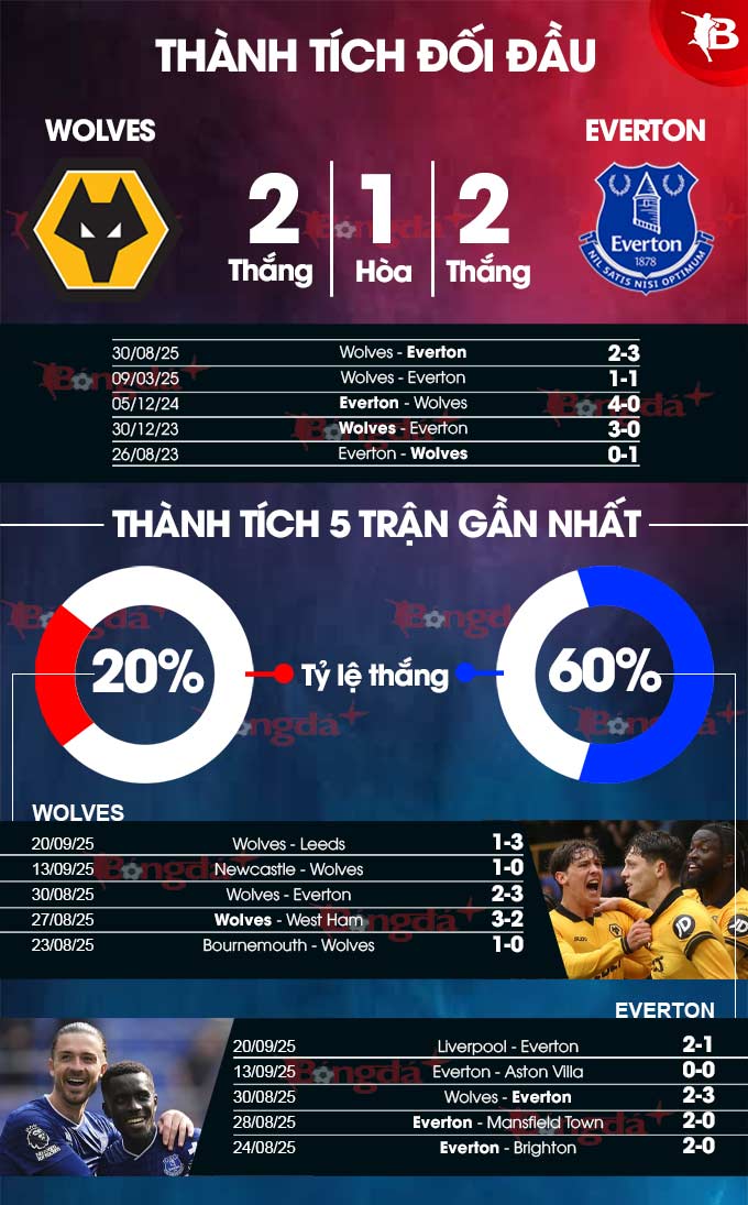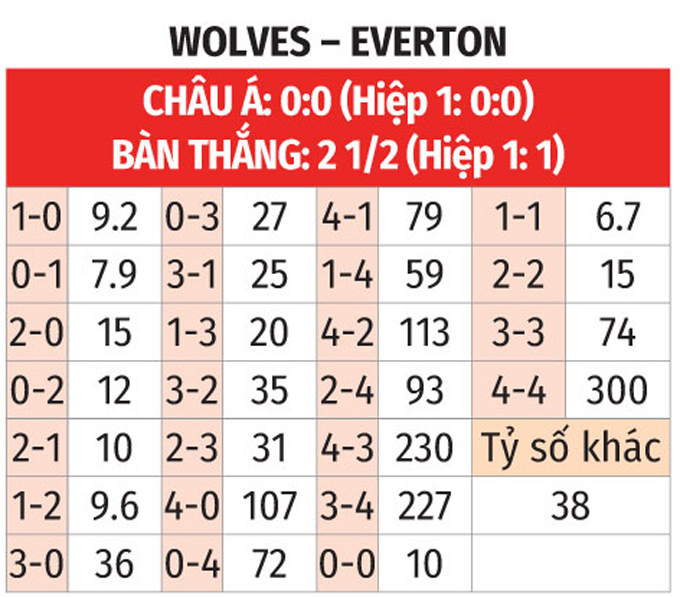 Trên BXH Ngoại hạng Anh 2025/26, Wolves đang đứng cuối cùng khi chưa giành được điểm nào. Họ thủng lưới tới 12 lần nhưng chỉ ghi được 3 bàn. Rõ ràng, phong độ của Wolves lúc này là rất tệ. Chiều ngược lại, Everton đang chơi tốt dưới thời của HLV David Moyes.
