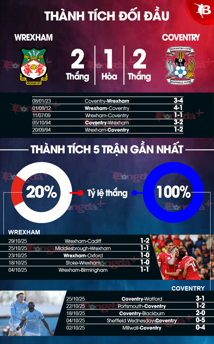 - Không đội nào giữ sạch lưới nhà: Cả 6 cuộc đối đầu gần nhất giữa hai đội đều khép lại với ít nhất 1 bàn thắng cho mỗi đội. Ngoài ra, 7/10 trận gần đây của Wrexham và cả 2 trận vừa qua của Coventry đều không có đội nào giữ sạch lưới nhà. Hơn nữa, 7/9 trận sân nhà gần đây của Wrexham cũng có tối thiểu 1 bàn thắng cho mỗi đội.