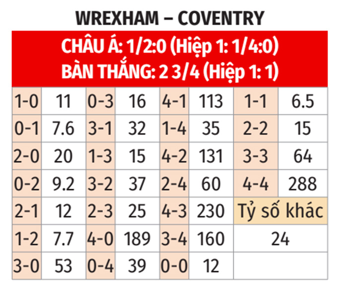 - Coventry thắng theo châu Á: Coventry thắng cả 6 trận gần nhất, thắng 7/9 chuyến xa nhà vừa qua. Còn Wrexham thau 5, hòa 1, chỉ thắng 2 ở 8 trận gần đây. Do đó, nhiều khả năng Coventry cũng sẽ thắng theo châu Á ở cuộc đối đầu lần này.