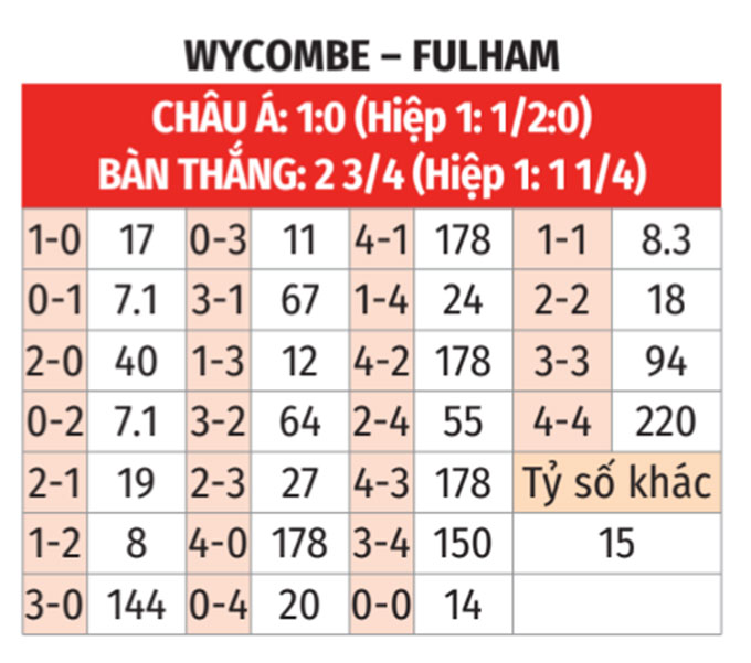 - Trên 2 bàn: 3/4 trận gần đây của Fulham đều có trên 2 bàn. 4/6 trận gần nhất của Wycombe Wanderers số lần lưới rung cũng luôn chạm tới ngưỡng 3.