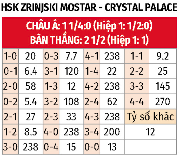 - Lẻ bàn thắng: 6/10 trận gần nhất của Zrinjski có tổng bàn thắng không chia hết cho 2. Ngoài ra, 7/10 trận sân khách vừa xong của Crystal Palace cũng chứng kiến điều tương tự.