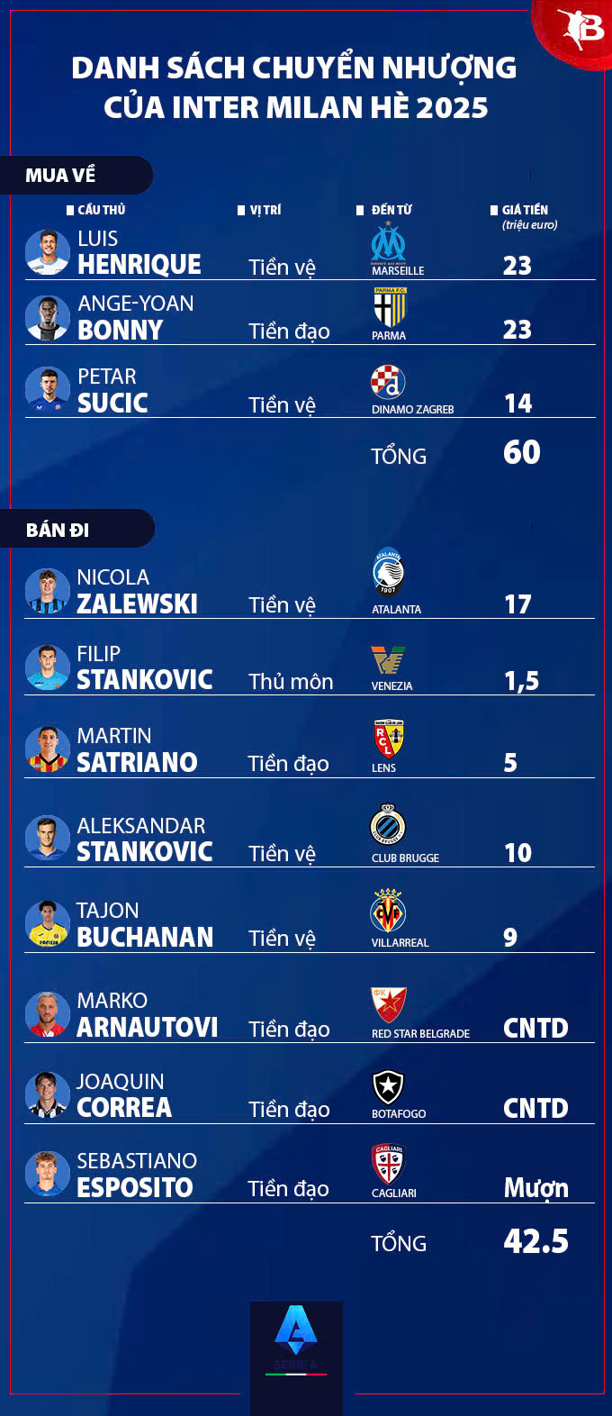 Với quyết tâm xua tan ký ức buồn mùa trước, Inter đã là một trong những CLB Serie A năng động nhất trên thị trường chuyển nhượng. Liệu nỗ lực này có đủ để họ đòi lại ngôi vương hay không vẫn là dấu hỏi lớn khi chúng ta nhìn về mùa giải 2025/26.